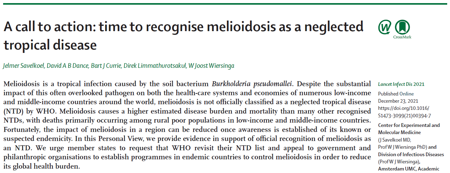 "We urge member states to request that WHO revisit their NTD list and appeal to government and philanthropic organisations to establish programmes in endemic countries to control melioidosis in order to reduce its global health burden ( Ref)."